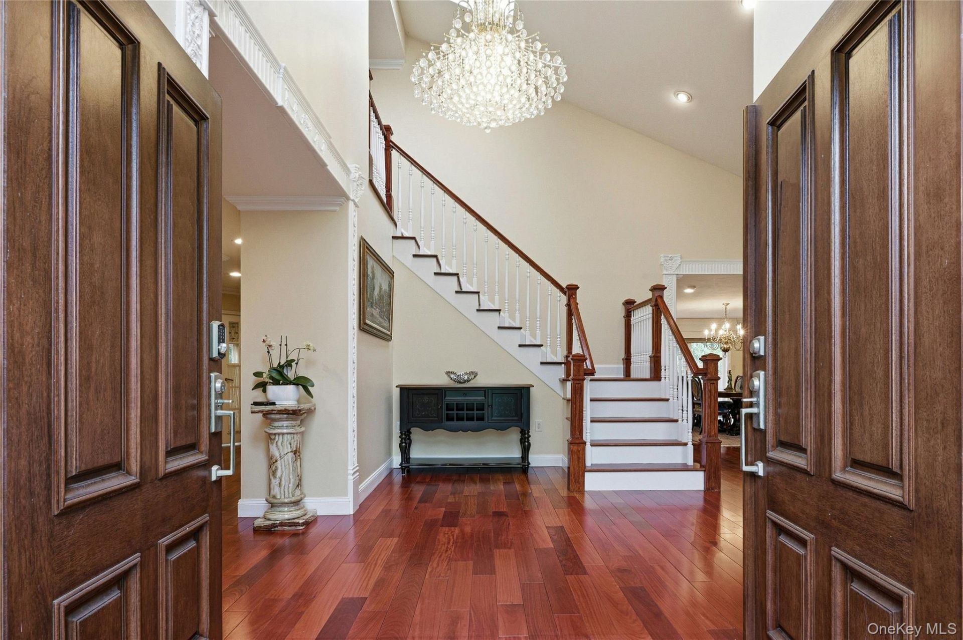 Discover refined elegance in this beautifully renovated C-model home, located in the exclusive gated community of Hamlet at North Hills. This distinctive 5-bedroom, 4.5-bath residence sits over half acre professionally manicured property with a seamless combination of classic design and modern luxury. A grand two-story foyer welcomes you into expansive, open-concept living spaces, including a soaring living room with a wood burning fireplace, a formal dining room opens to the deck, ideal for entertaining, and a warm family room with its own fireplace with access to the deck as well. The chef's kitchen features high-end appliances, custom cabinetry, and a spacious center island. A main-level guest suite adds convenience and flexibility. Upstairs, the primary suite offers a private retreat with a spa-like bath, walk-in closets, and peaceful views, alongside three additional generously sized bedrooms and two full baths. Outdoor living is enhanced by a new Trex deck and a full-house generator ensures comfort year-round. Residents also enjoy premium amenities, including tennis courts, a pool, gym, and a scenic pond with a walking path. Shelter Rock elementary school, Manhasset middle/high. Minutes away from major highways and shopping.